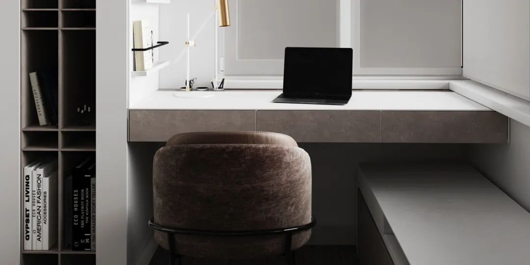 The white wall embedded in the wooden dressing table makes the space more visually dynamic and gentle, and the elegant wood color in the space allows people to wander in the natural atmosphere and relax.