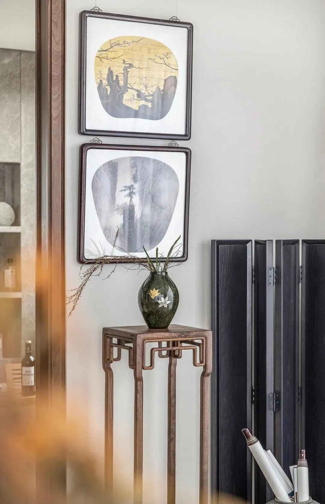 Through the artistic language of tripartite interaction among people, space and nature, the façade is echoed by landscape painting and calligraphy, natural texture of marble and carpet texture. It creates the natural texture of the space, showing the space temperament and rich connotation. The calligraphy and painting form subtly forms a counterpoint with the chandelier in the atrium, and the visual direction from near to far presents the modest attitude of a gentleman in the space.