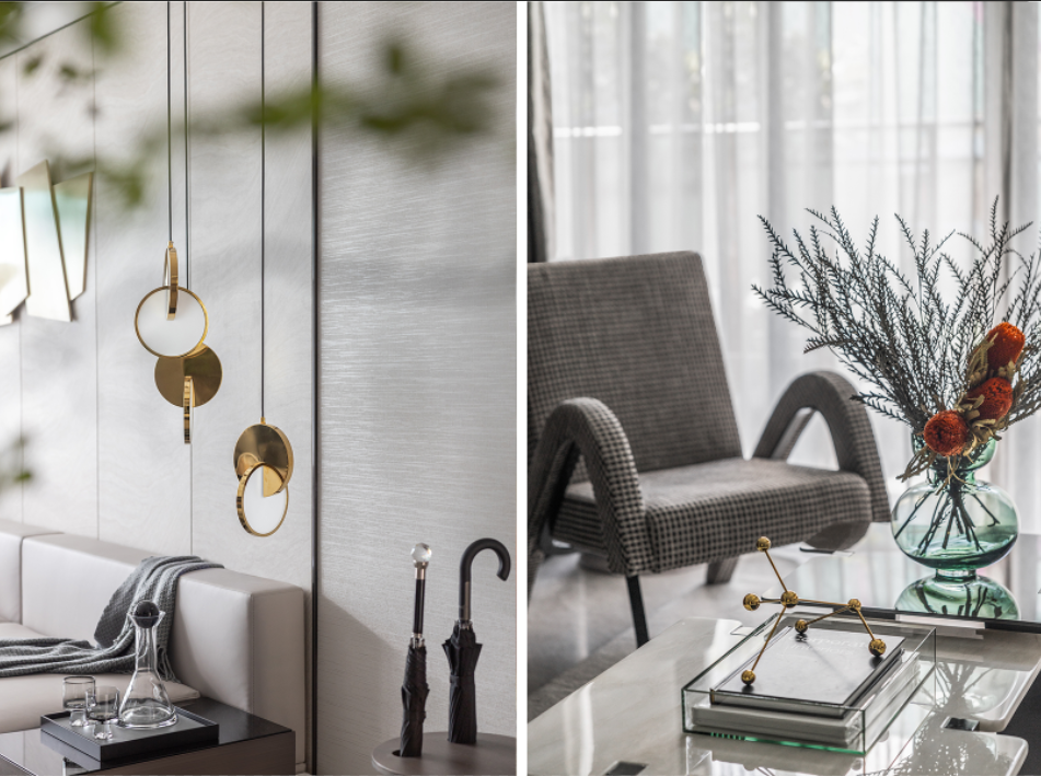 The geometric brass elements in the details are the expression of endless art, cutting space with lines to create meticulous. The luster creates texture and increases the tone of the space.