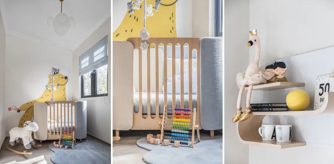 The wall is painted as a fun teddy bear, and the display is used to create a paradise theme nursery. On the crib are cute cloud pillows and animal dolls, which form an aesthetic contrast with the lamb rocking chair toy ornament on the floor. This shows a soft and warm space atmosphere, where innocent and pure little lives are cared for.
