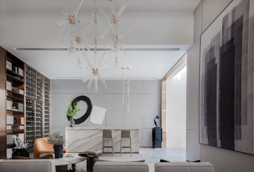 The interior furniture and accessories are mostly simple geometric forms, classic and capable lines first outline the general style of the space, orange and red with black and white color block combination appropriate filling, with linen cotton fabric, marble furniture to add layering, different materials and texture overlap, creating a modern temperament and artistic atmosphere.