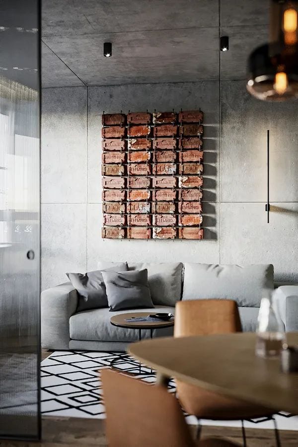 The rhombus pattern on the carpet brings a sense of dynamism and art. The combination of gray concrete and red brick decoration on the wall is rich and delicate, with a layered sense.