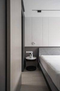 The master bedroom at the end of the hallway is refined with open cabinetry as a visual focal point, invisible skirting lines, and ultra-thin door covers.