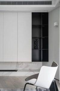 The “from-nothing-to-all” structure of the lobby and the pure white minimalist cabinetry expand the entry storage space; the L-shaped linear lighting is exquisite and soft, soothing for the home comers.
