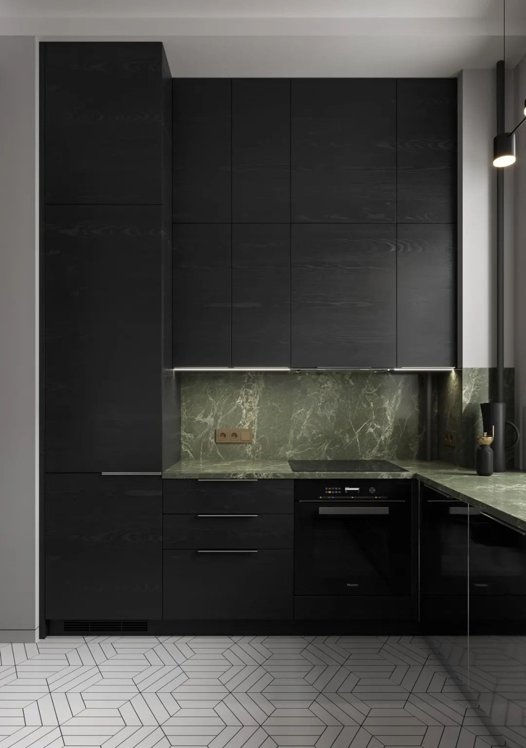 The dining room is set in the kitchen, the kitchen design is more in line with contemporary habits of life, black cabinet, white walls and floors, minimalist to the extreme. The emerald marble on the countertop and the orange glass on the table top make a splendid spice for the monotonous space.