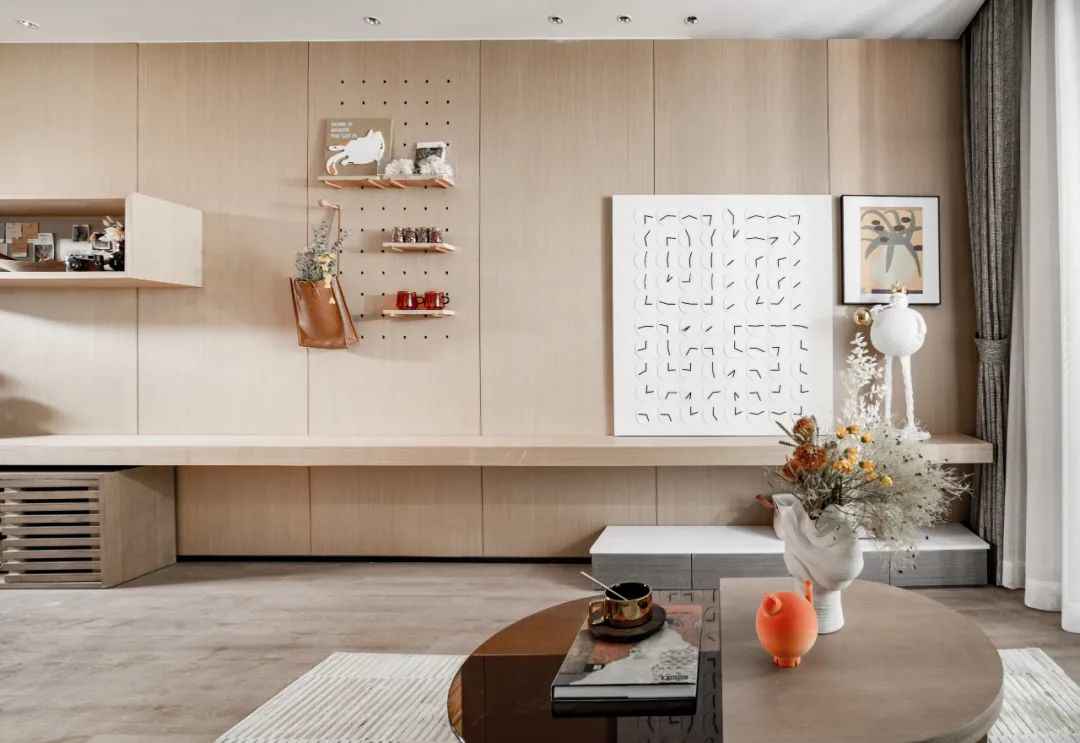 The study uses a simple combination of panels and volume to keep the space as simple and pure as possible. High and low staggered wood color blocks are interspersed, and the whole is elegant and natural.