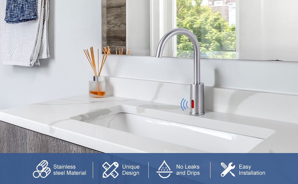 - Premium bathroom faucet: The main body of the touchless faucet is made of solid brass, heavy-duty and durable. Mirror-like chrome finish, unique design for creating a never outdated shaping.