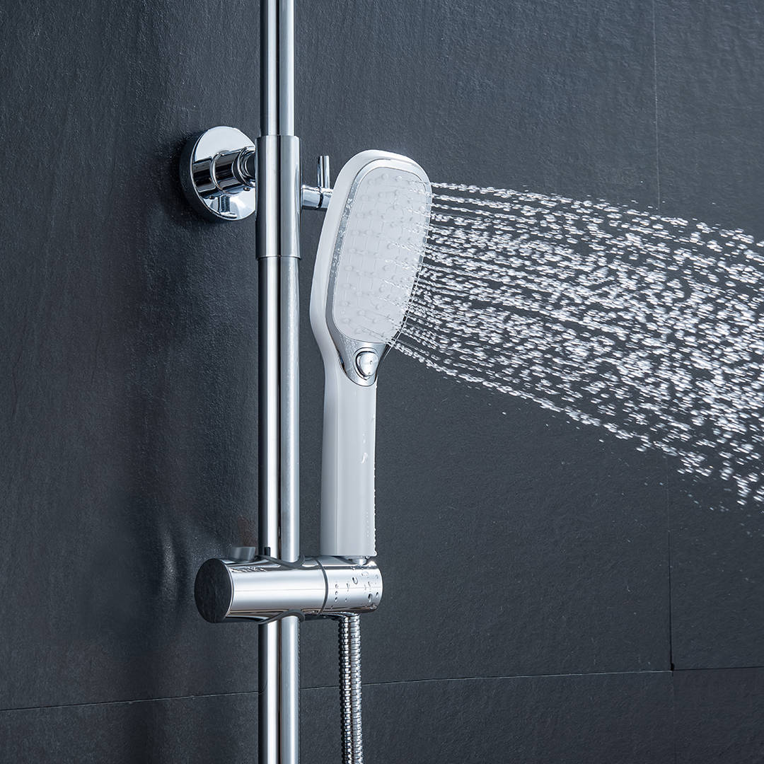 Replace your old showerhead with an elegant rain showerhead; hand shower with hose; adjustable slide bar. Sleek 9″ rain showerhead easily pivots side to side on an elegantly arched shower arm. Integrated brass slide-bar allows adjustable height control of the hand shower and brass soap dish while providing a conveniently located diverter for switching functions.