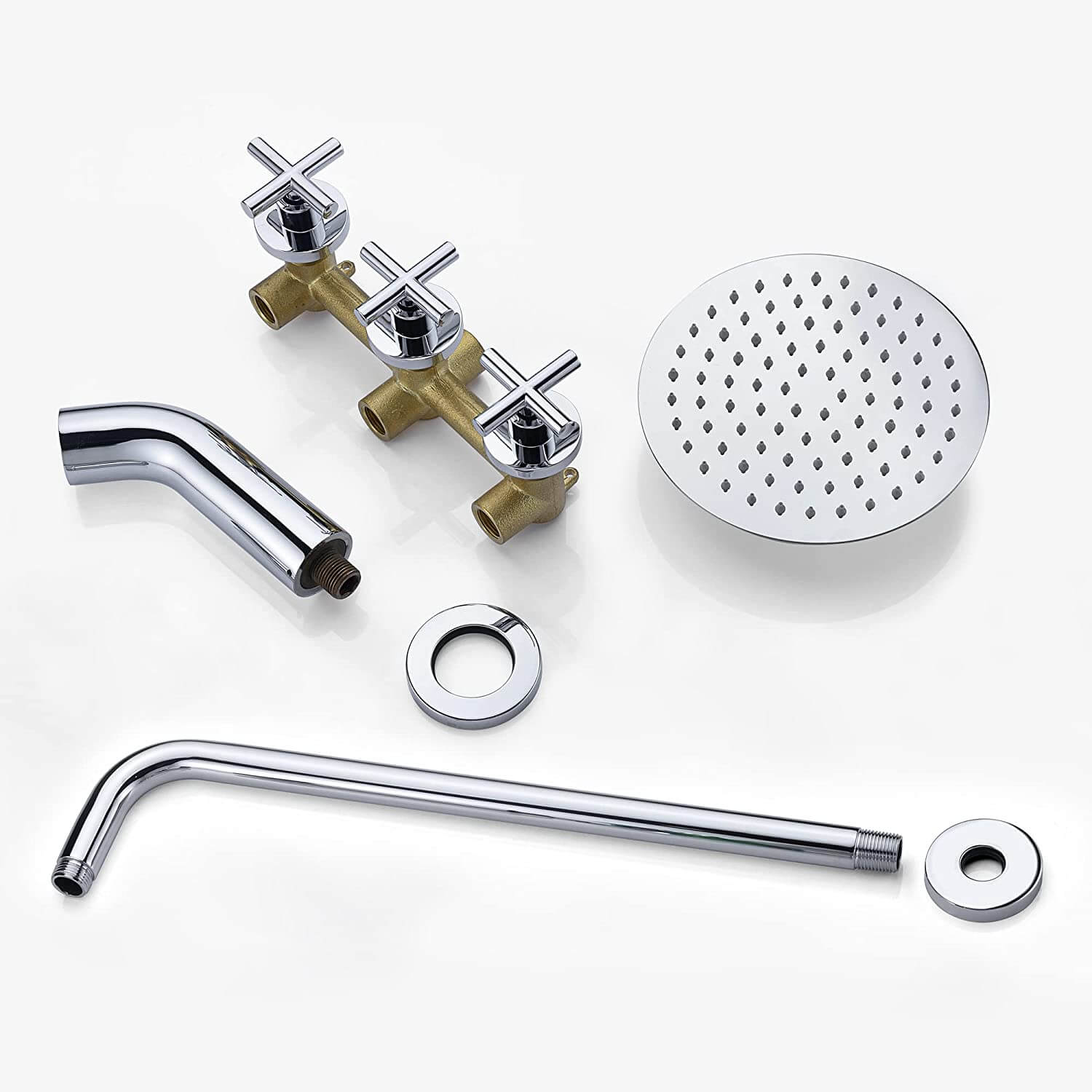 - Classical 3-cross handles easily adjust the water temperature and flow with the sleek operations. Ultra-thin 8 inches SUS304 stainless steel shower head, ensuring water saving and providing aesthetic appeal.