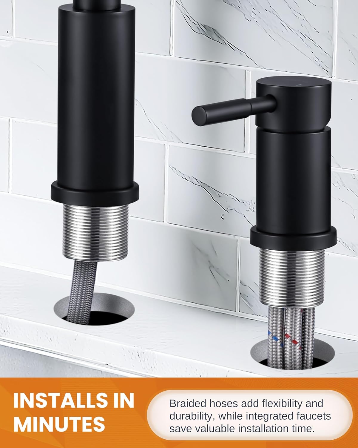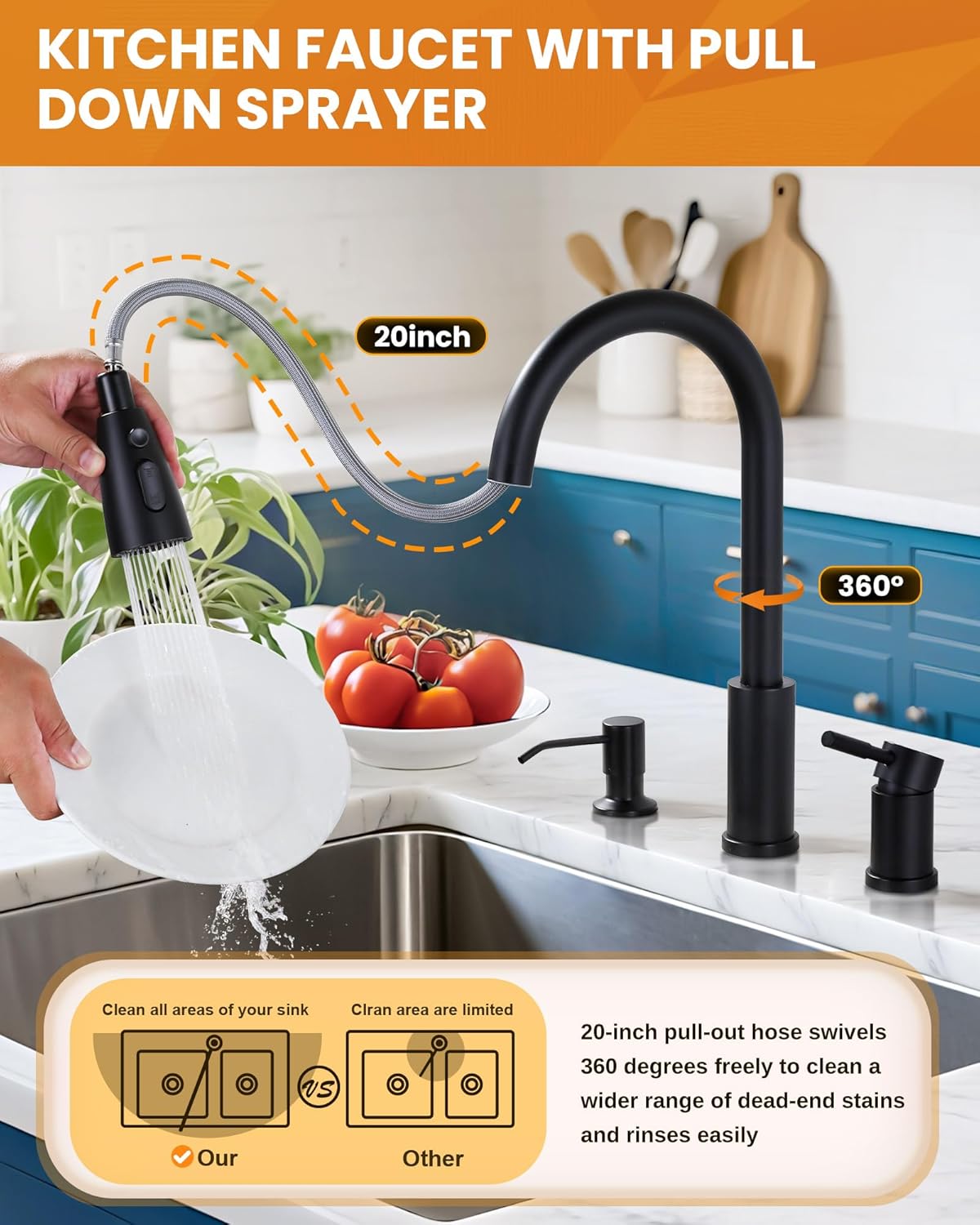 ✅【FRIENDLY INSTALLATION】Our 3 hole kitchen faucet comes with pre-installed hoses and all necessary hardware for three-hole sinks, which can be easily installed, you can even finish the installation independently in less than 15 minutes without hiring a professional plumber, which can help you save time and money.