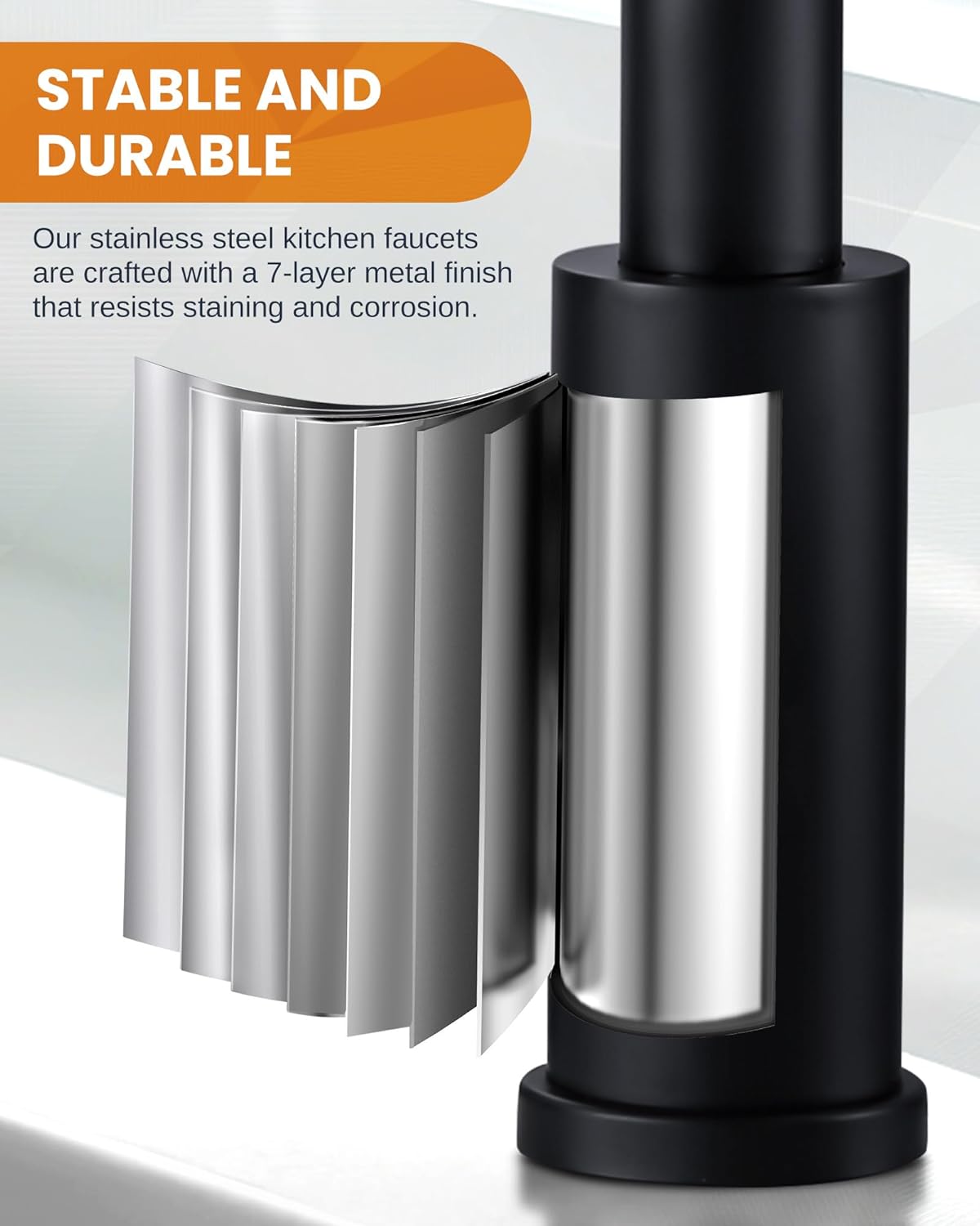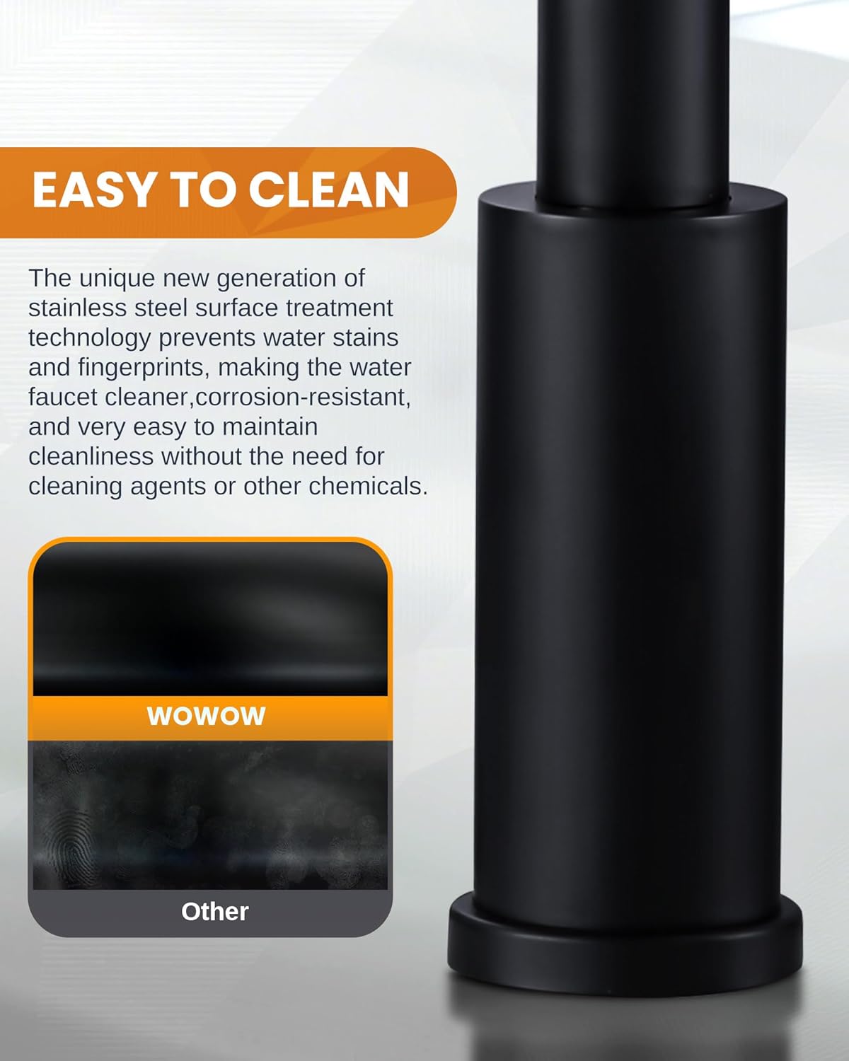 ✅【HEALTHY QUALITY】This kitchen faucet black is made of SUS 304 stainless steel with upgraded non-drip ceramic valve and high temperature resistant PEX hose for long life, its ceramic valve cartridge has been tested over 1 million times for leakage prevention, every WOWOW residential kitchen and bathroom faucet meets the Federal Safe Drinking Water Act and California Act 65 standards, making WOWOW a clean drinking water safe choice for clean drinking water.