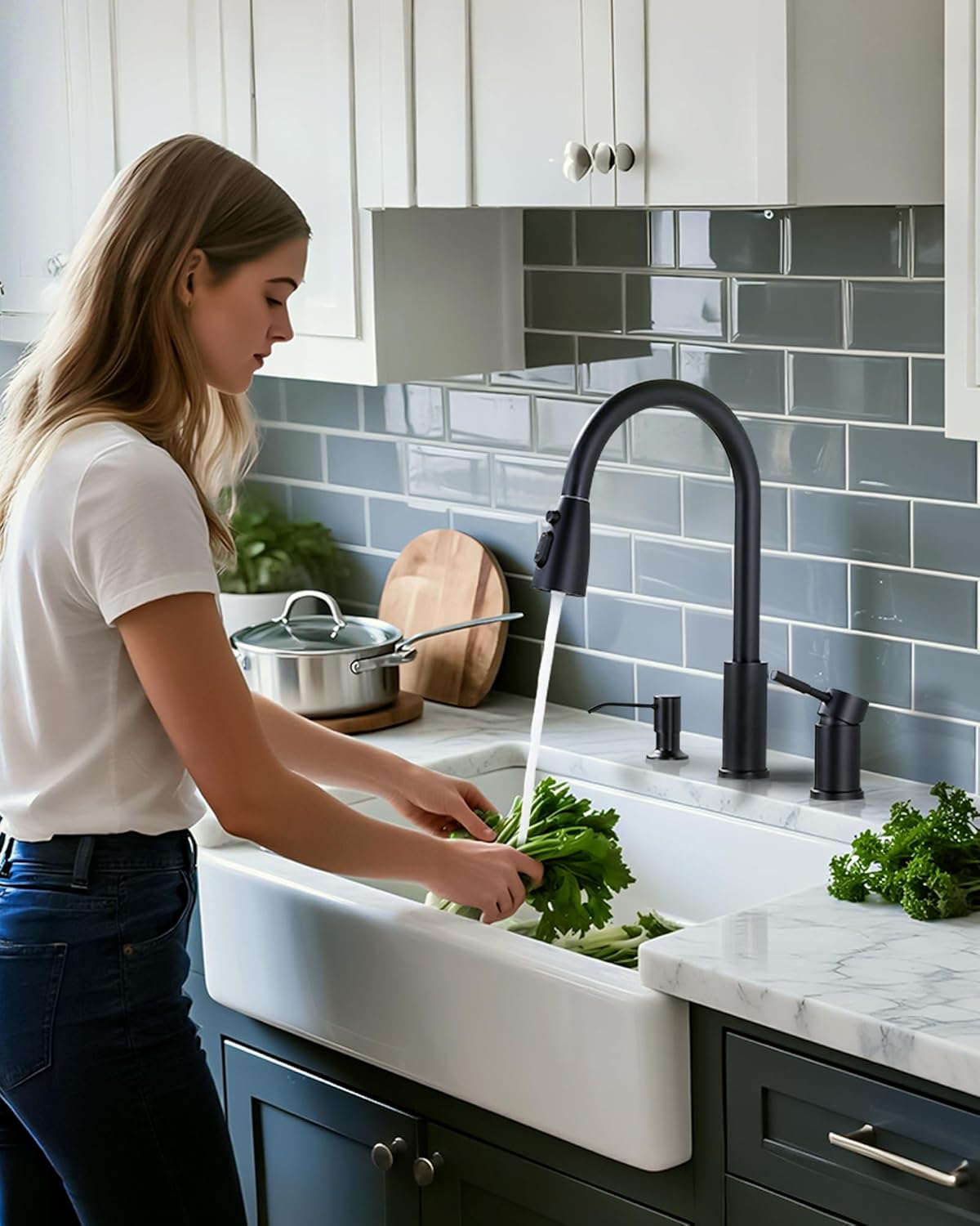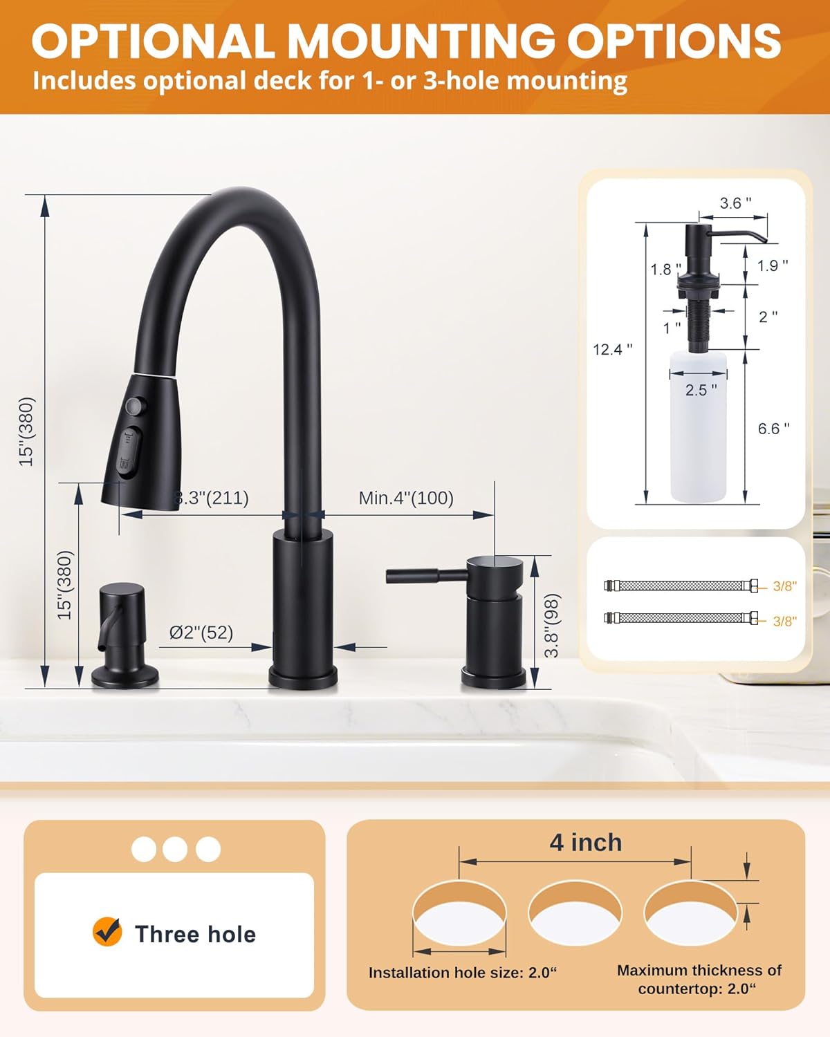 ✅【GREAT VALUE FOR MONEY】 WOWOW Kitchen sink Faucet Set includes a 15-inch faucet and a 12.4-inch soap dispenser. The multi-function soap dispenser is suitable for hand sanitizer, dish soap and more. Affordable and cost-effective, this matte black kitchen faucet set is designed to perfectly meet your kitchen needs (Flow rate: 1.8gpm/6.8L/min)
