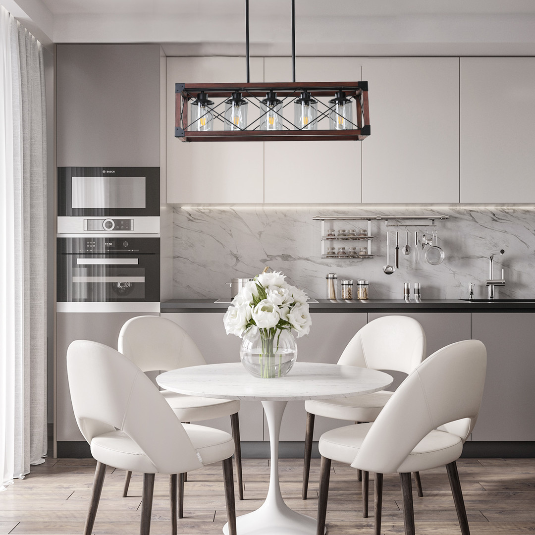 WOWOW 5-Light Red and Black Wood Farmhouse Chandelier with Glass Shades and Adjustable Height for Kitchen Island