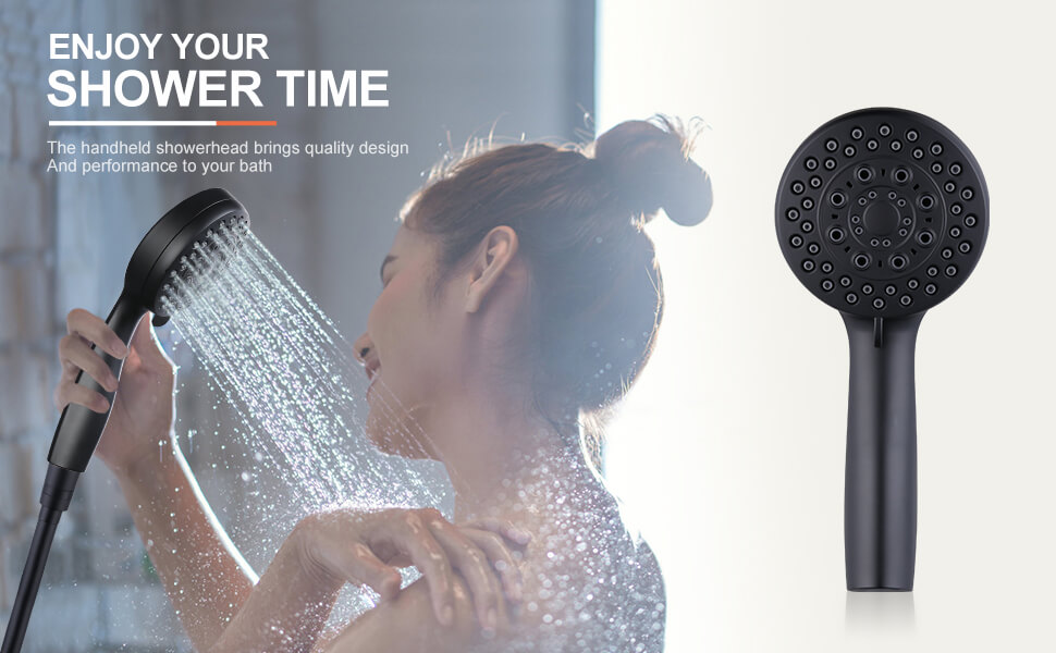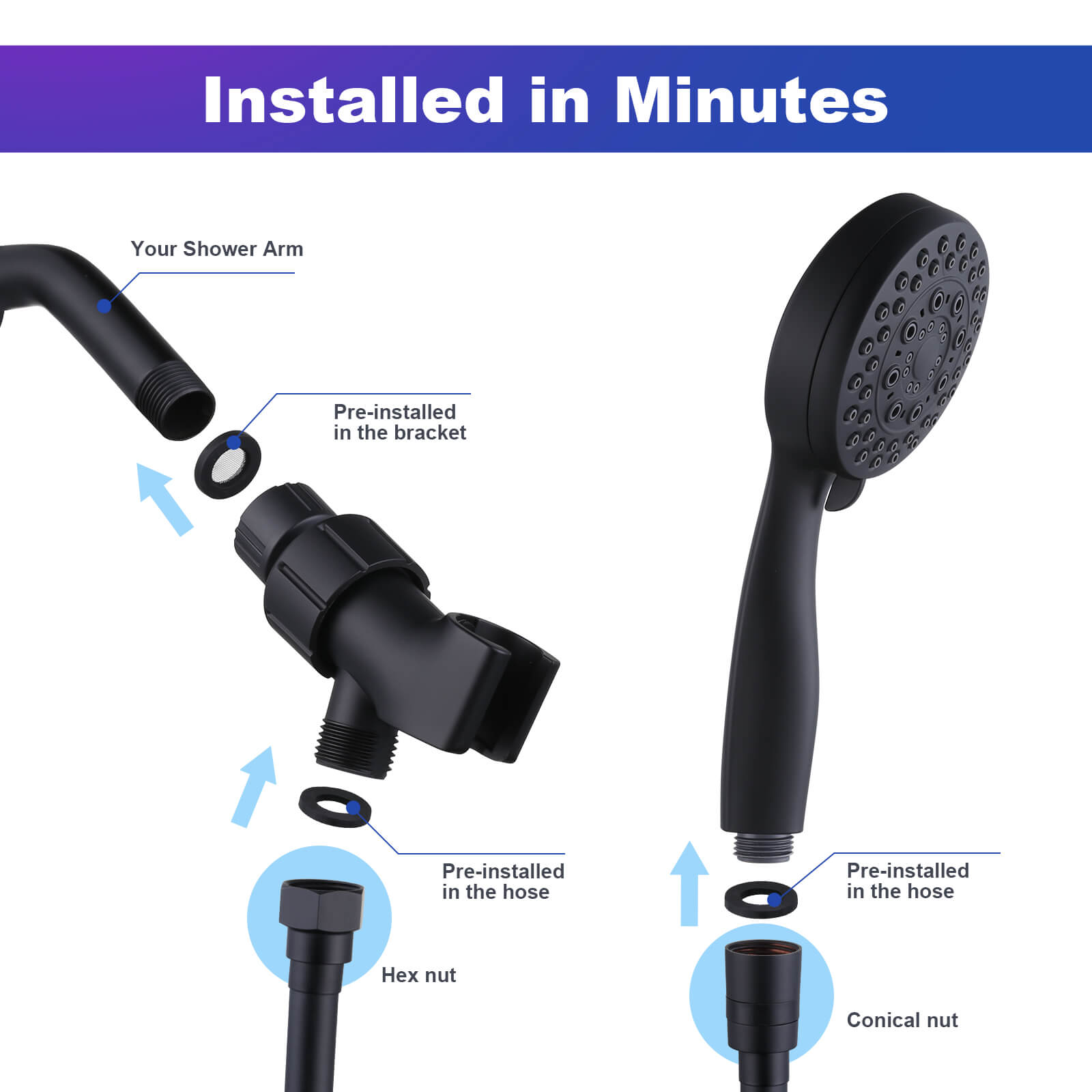 【Premium Material】Matte black plated premium ABS shower, bracket and 59″ PVC shower hose,making it durable, rust-proof, fade-proof, resists fingerprints and water spots. 360° swivel-adjustable bracket for adjust the angles and directions as you need. Dual solid brass hose nuts for a reliable leak-free connection.