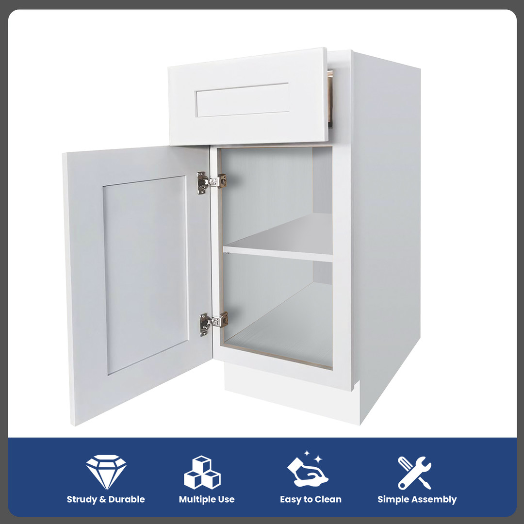 • Drawer has slides that let it fully extend, soft-closing hinges on doors prevent noise, ensuring a peaceful kitchen atmosphere