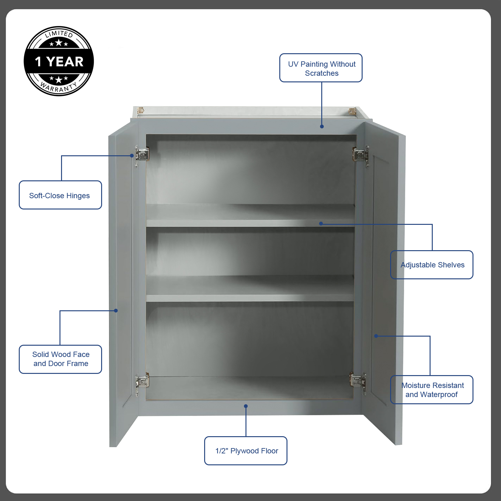 Elevate your kitchen’s appeal with our stunning cabinets, designed to stand out in any home with their sleek, modern satin finish. Enjoy the serene silence of our slow-close doors, which glide shut effortlessly without a hint of noise. Crafted from sturdy Plywood and Birch, these cabinets offer durability you can trust. The 2 adjustable shelves allow you to customize their height to suit your needs. The interiors are coated with a scratch-resistant, easy-to-clean finish, ensuring they stay pristine over time. Choose our cabinets for a seamless fusion of sophisticated style, seamless efficiency, and unparalleled convenience, perfectly suited to meet your daily needs and aesthetic preferences.