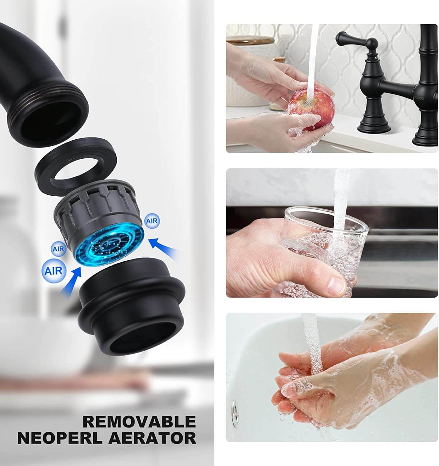 - 【Care For Your Health】The heavy-duty bridge kitchen faucet is made of premium solid brass, non-rust, non-erosion. Water quality is guaranteed by unique techniques for preventing lead and scaling, which is beneficial to a healthy lifestyle.