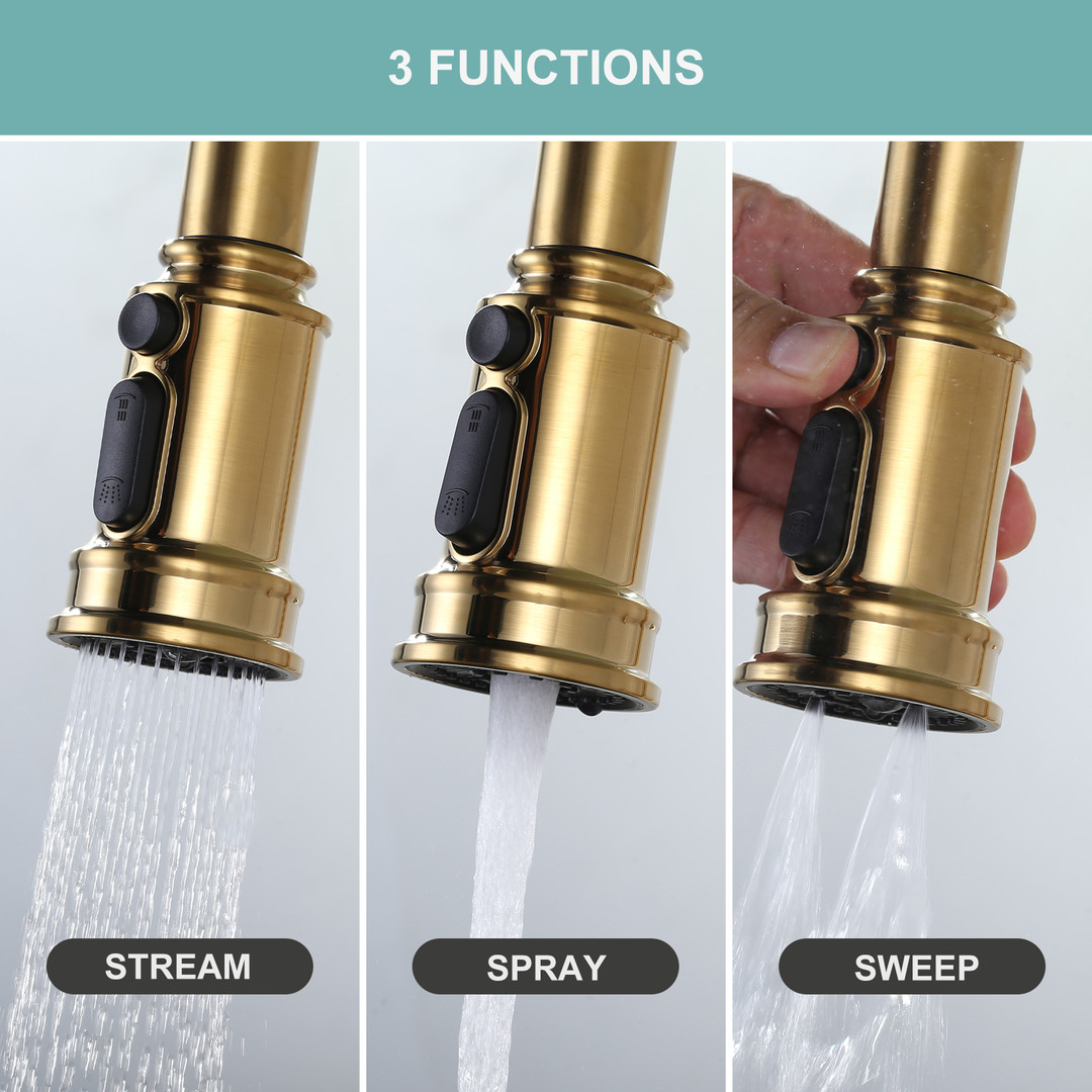 - Pull-down spray design seamlessly switches between three water delivery modes at the touch of a button: fine stream, powerful spray, and comfortable sweep