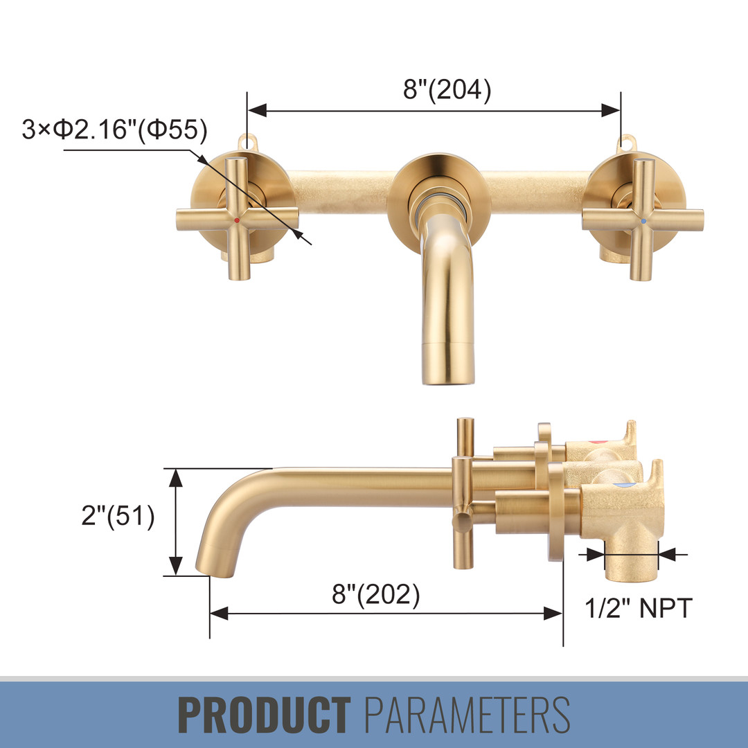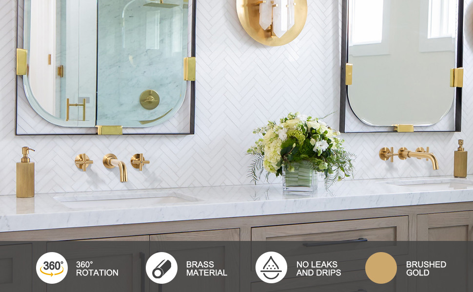 WOWOW Brushed Gold Cross Handle Wall Mounted Bathroom Sink Faucet