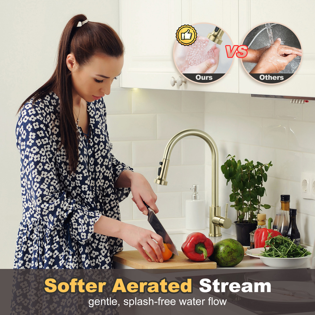Three-Function Settings: Gold pull down kitchen faucet with 3 mode settings of spray, steam and pause. The multifunctional faucet with 3 setting modes allows you to easily switch from aerated flow to powerful spray. Sink faucets help with various tasks in the kitchen space.
