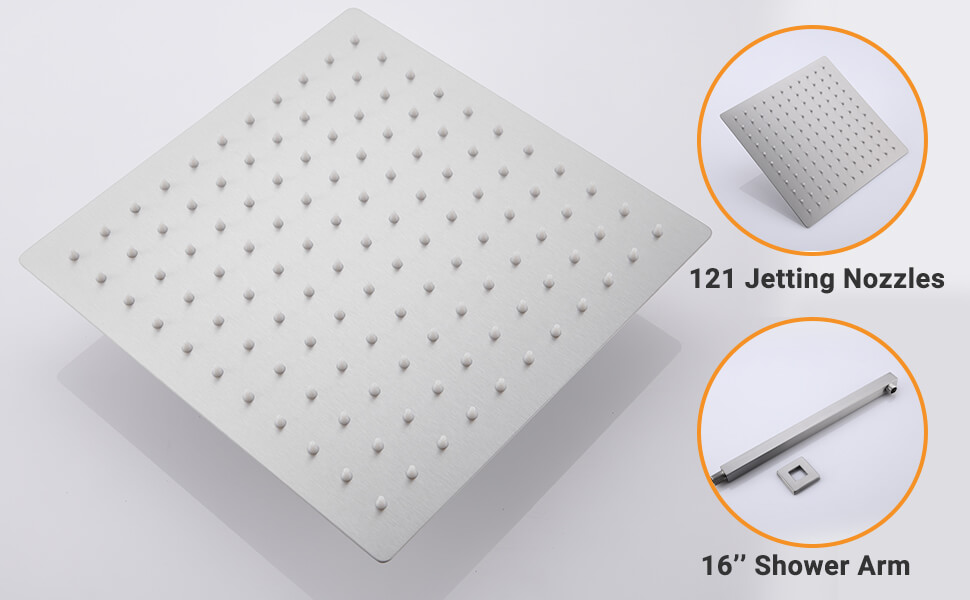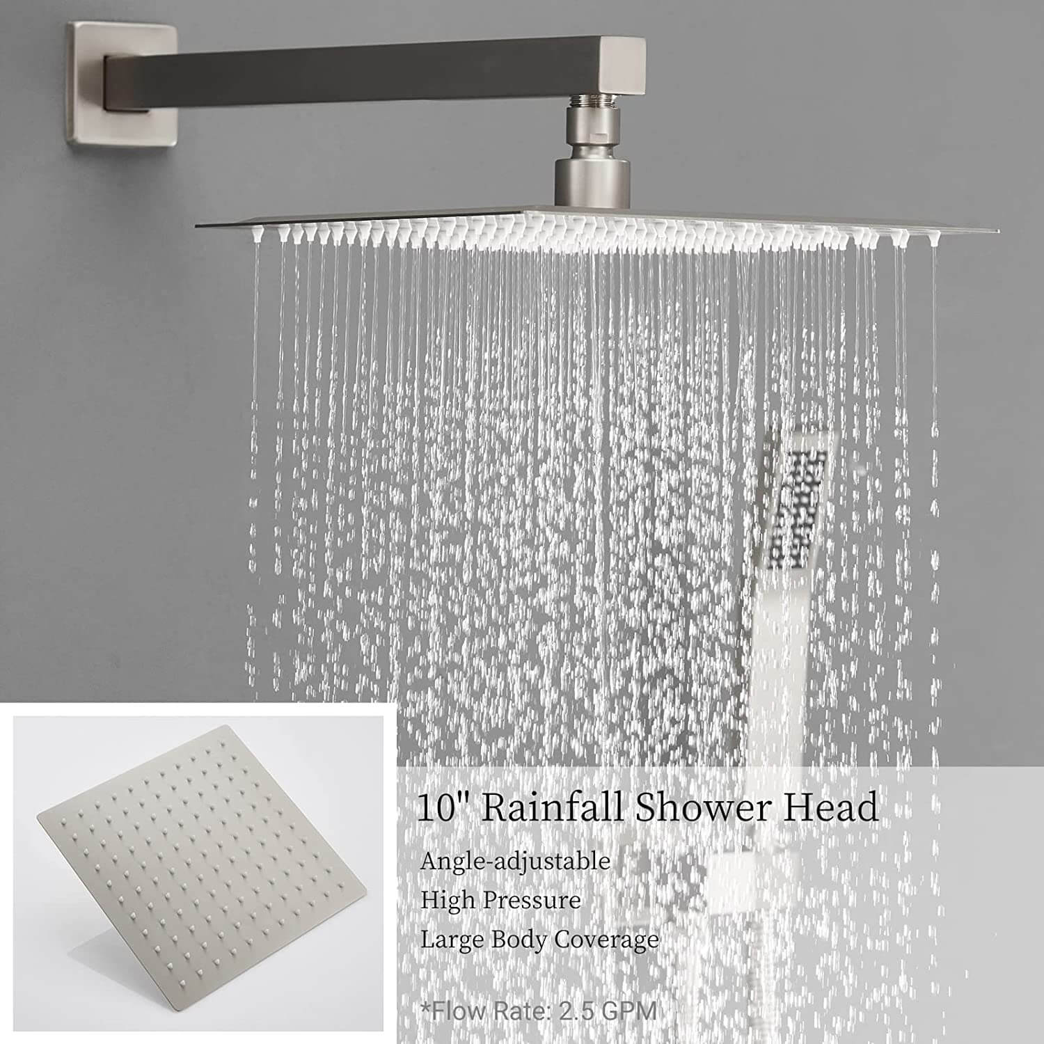 ➤High Pressure Rainfall Shower Head: Air-Water Mixing Technology for the 10 inches rainfall shower head allows boosting water pressure up to 2.5 GPM. Angle adjustable to get a straight-down rainfall shower experience or to a shower angle you preferred.