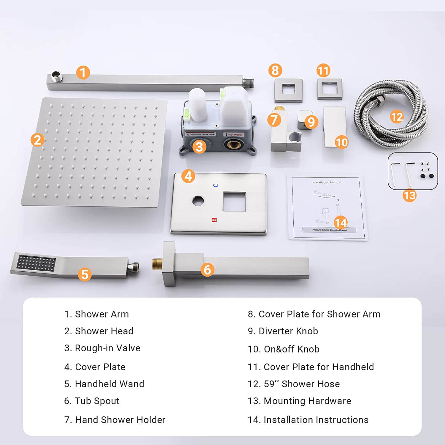 ➤Shower Faucet with Valve: The rough-in valve body constructed of #59 solid brass is corrosion & tarnishing resistant. All the interfaces utilize US standard NPT thread and 1/2” connection for easy installation. Ceramic Cartridge balances water pressure and protects you from any scalding or cold shock.