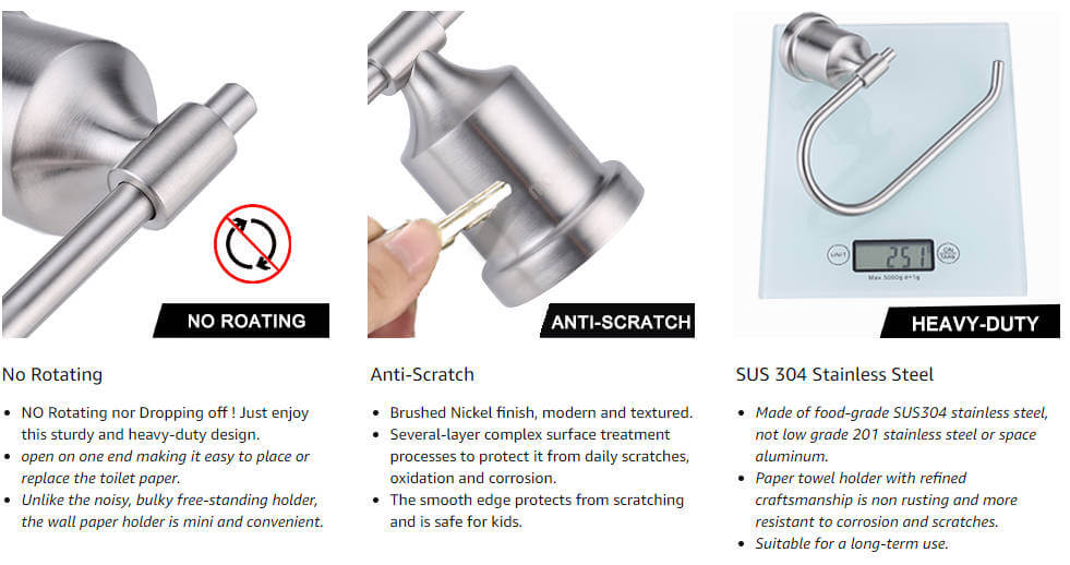 - 【Modern Style】Classic brushed nickel finish creates a simple and modern style that complements your other bathroom accessories. It could not only use as a toilet paper roll holder, but also as a hand towel holder.