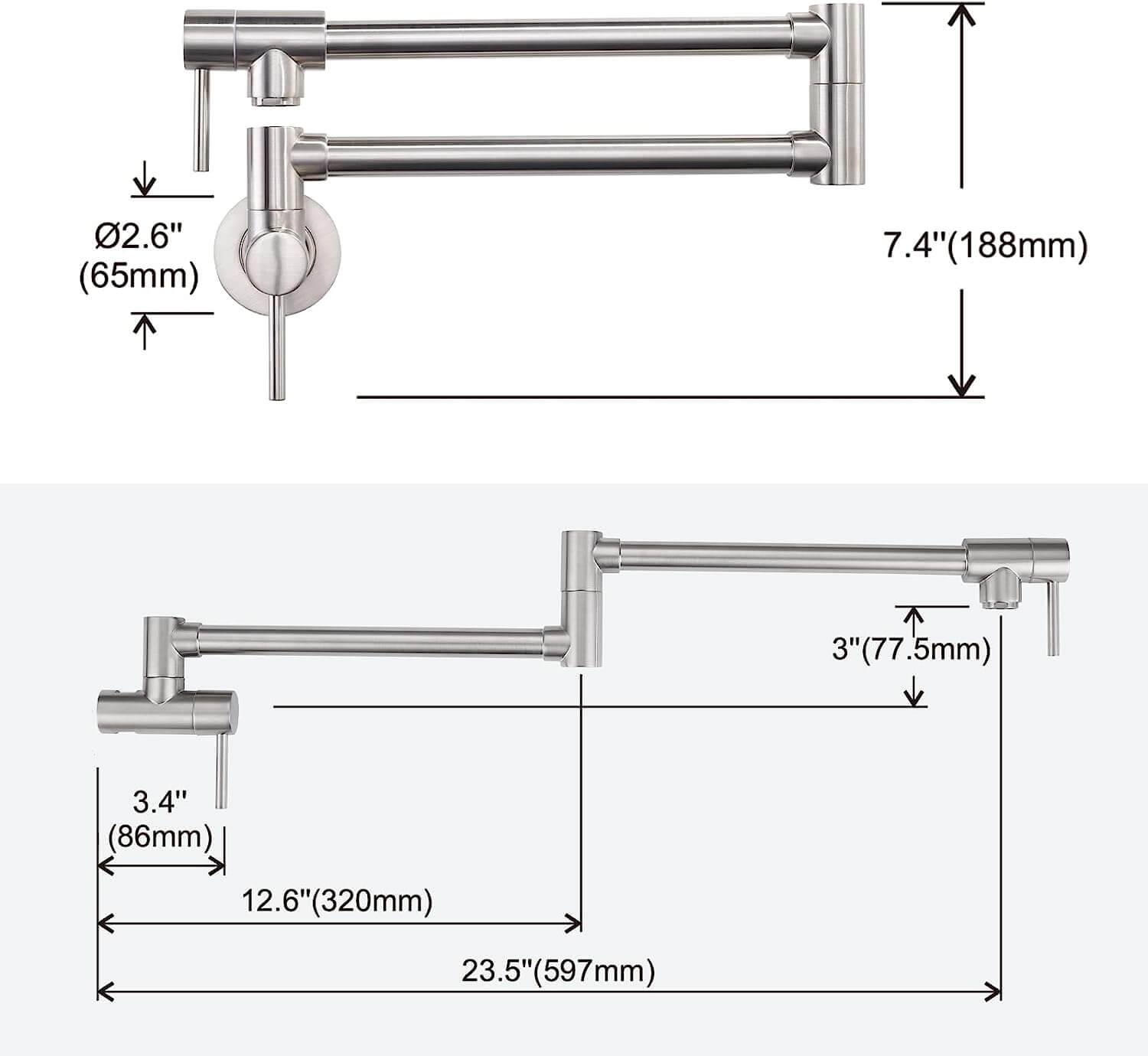 Dimension: The most extreme expansion length of this potfiller is 23.5 inches, we utilize for either cold water or hot water. The faucet is one hole wall mounted with double swing joints that can turn 360 degrees, double valve control has more noteworthy adaptability in use.