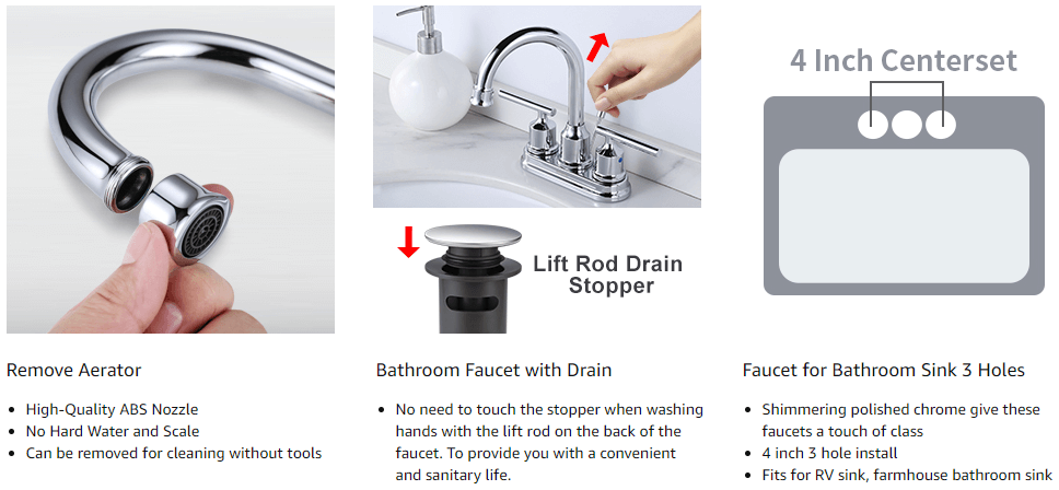 ✅ EASY INSTALLATION: The 4 inch centerset bathroom faucet comes with a lift rod drain assembly & a pair of gloves. 4-inch centerset and 3 hole mount design allow for easy installation.