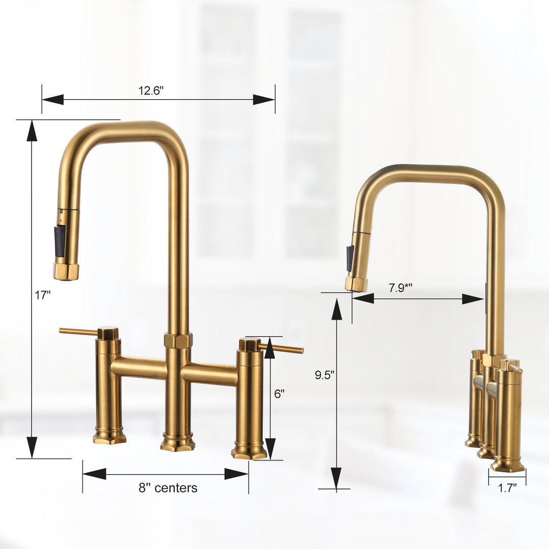 WOWOW Centerset Brushed Gold Farmhouse High Arc Bridge Kitchen Faucet with Pull Down Sprayer