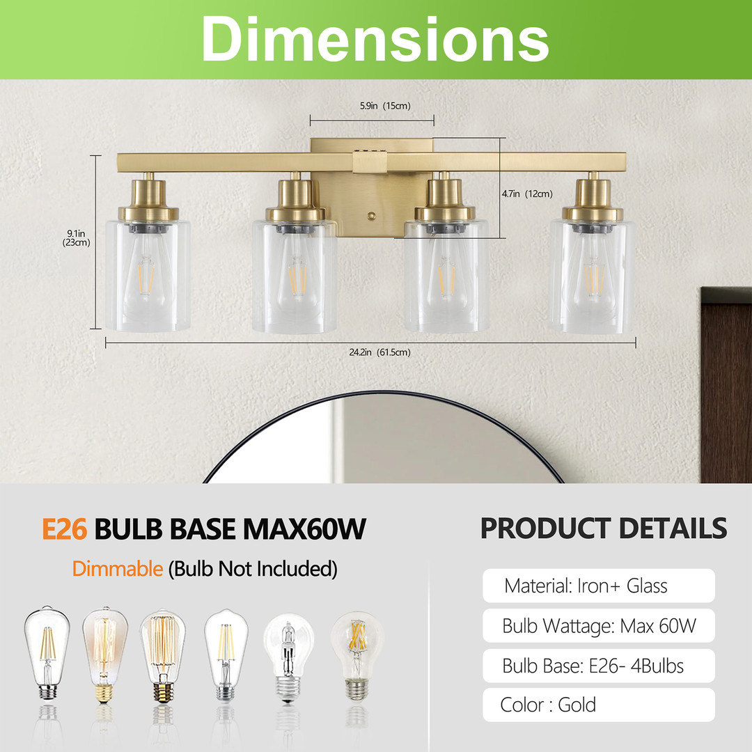 - Bulb requirements: this bathroom vanity light is compatible with incandescent, LED, CFL and other E26 standard medium sized head bulbs up to 60-Watt (bulb not included)
