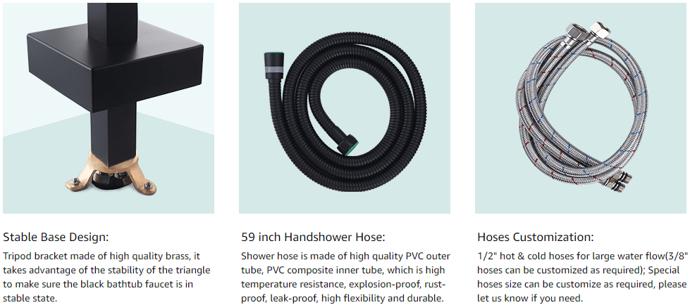 ✅ Waterlines: The freestanding bathtub faucet handheld shower comes with 1/2″ hot and cold hose for high flow (3/8” hoses can be customized as required); Special hoses size can customize as required.