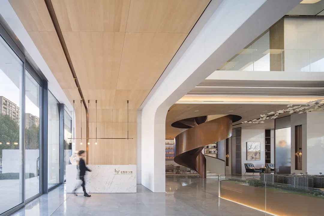 The bronze-colored revolving staircase on the side of the sandbox is an important visual element. It guides the movement from the main hall to the negotiation area, and the twist and interruption enriches the space level.