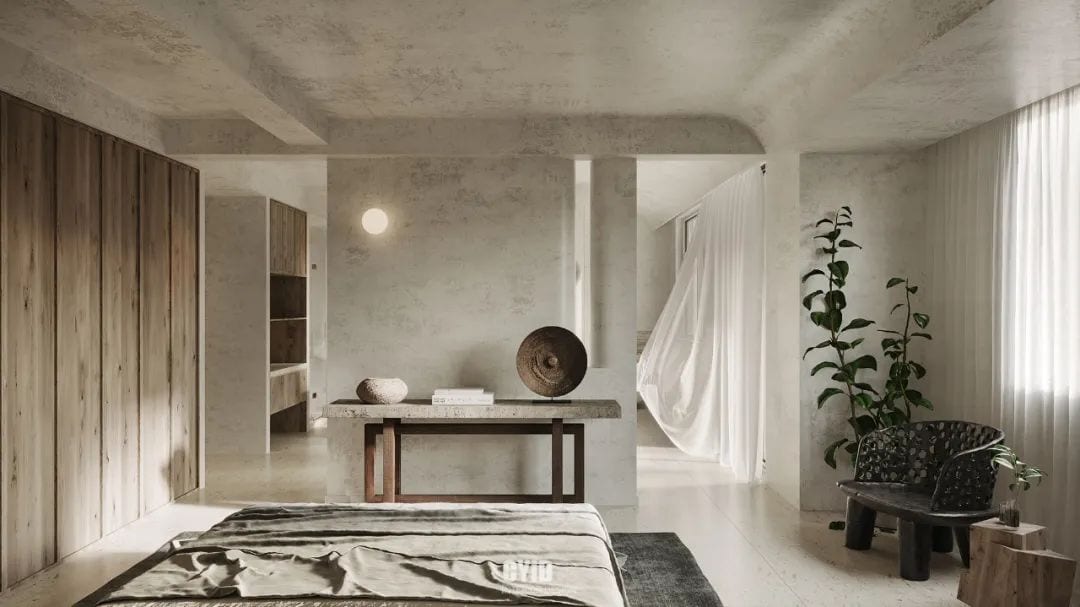 The roof and walls of the master bedroom continue the overall tone, creating a mottled texture of the wall, silent tone, simple lines, combining the old and new, the use of natural and rough natural materials, while the floor is all terrazzo. Between the combination of sophistication and roughness, it presents an aged and modern beauty that collides with the minimalist environment of the space to create a new visual atmosphere.