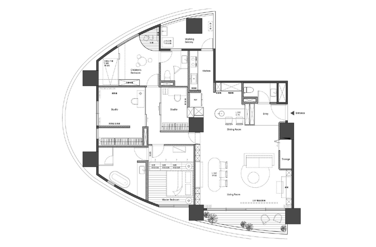 The designer divided the public area according to the owner’s demand for public and private areas, and the public area is based on the concept of “friendship hall”, giving an open space for emotional communication between family members. The private area is to create the concept of “personal studio”, providing a private place for family members to do their own work.