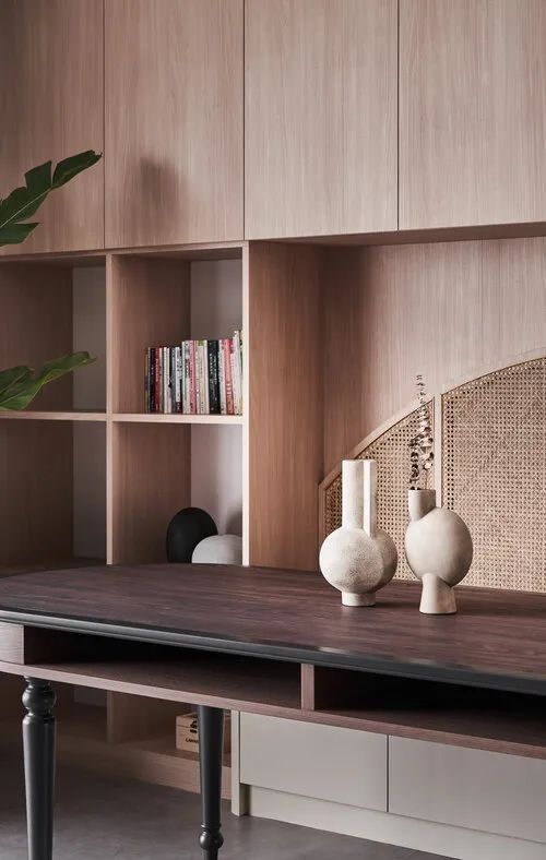 Unlike a typical dining room, the designer used hand-woven chair backs combined with bookcase storage and a custom-made dining table to create a casual dining area. The daughter often sings and dances on the bench, and the extended dining table design and small drawers can also be used as a temporary work table.