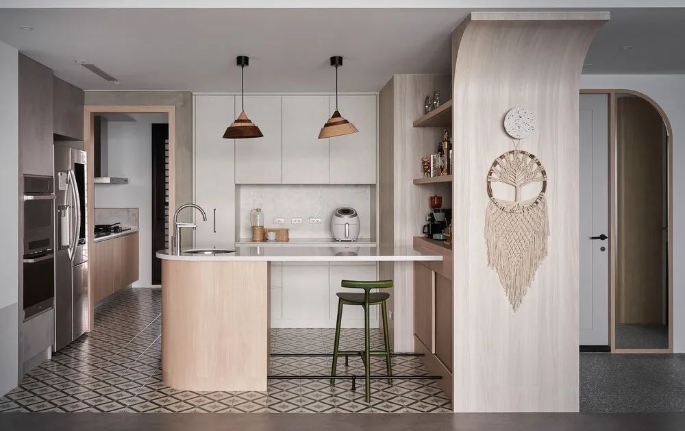 The square-shaped tiles have a fresh and retro look, and the rounded edge of the island allows for a more fluid flow.