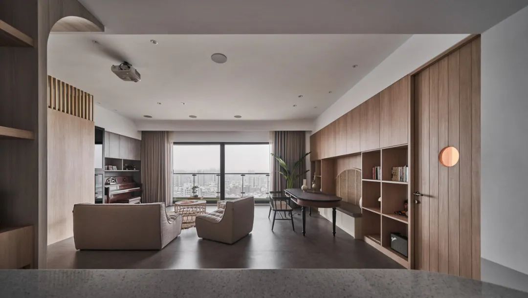 The public space consists of the living room, dining room and kitchen, and the living room becomes a fellowship hall for family life, facing the window, with a panoramic view of Kaohsiung city. When the projection screen is lowered, it is instantly transformed into a small theater hall.