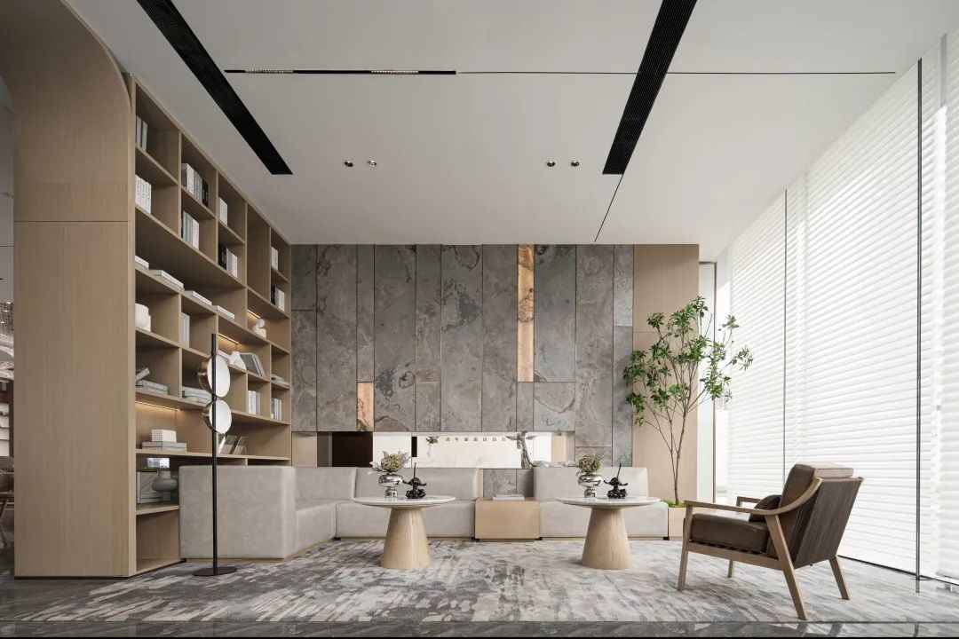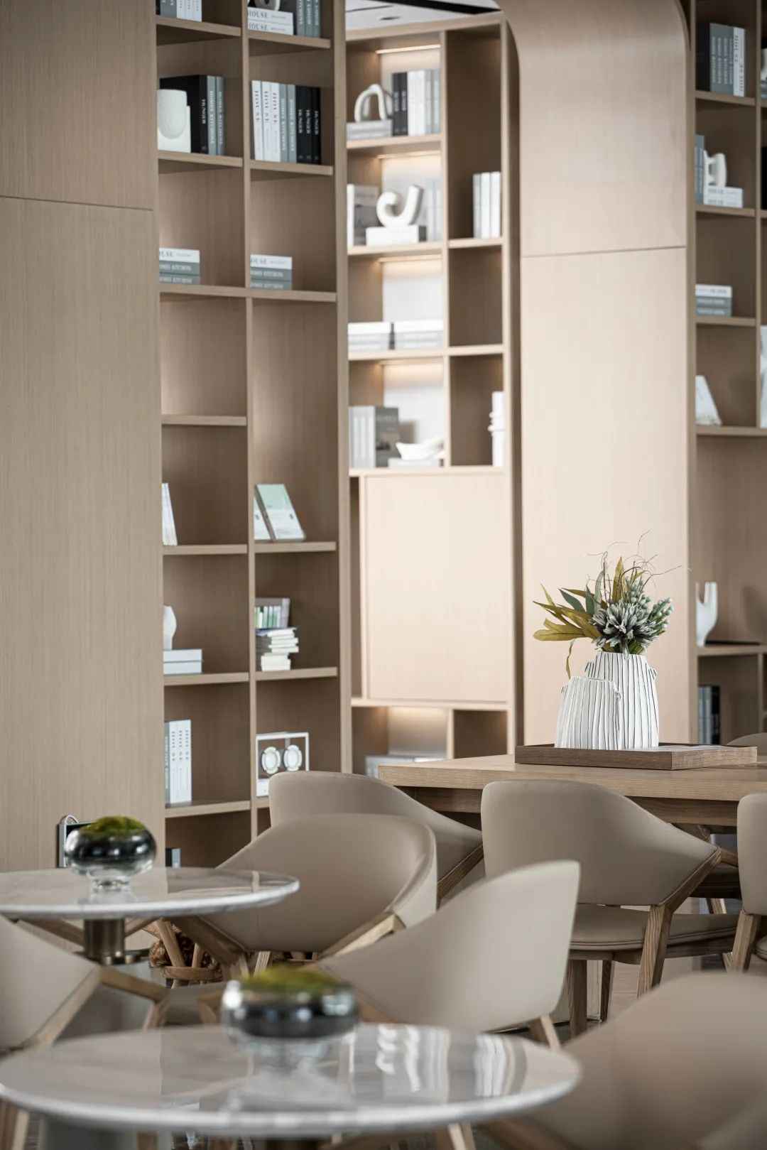 With quiet and beautiful, and rich in unique design sense, the shape gives the experience hall a beautiful visual feeling. The light-transmitting stone collides with the wood veneer material, and the curves and straight lines mingle. The bookcase on top echoes with the small round table, establishing the quality of the space.
