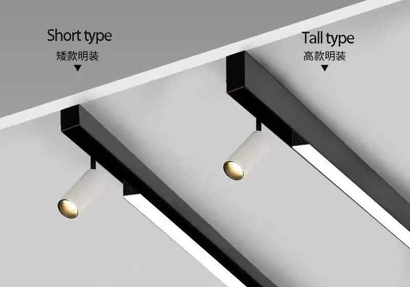 The design of the magnetic light adopts the concept of modularity. After presetting the track, you can freely choose the style of light source. You can choose from a very large variety. Downlights, spotlights, grille lights, flood strips, pendant line lights these can be selected, but also a variety of styles with the use. The style of the luminaire determines the effect of the light source is different, suitable for a variety of different scenes needs.